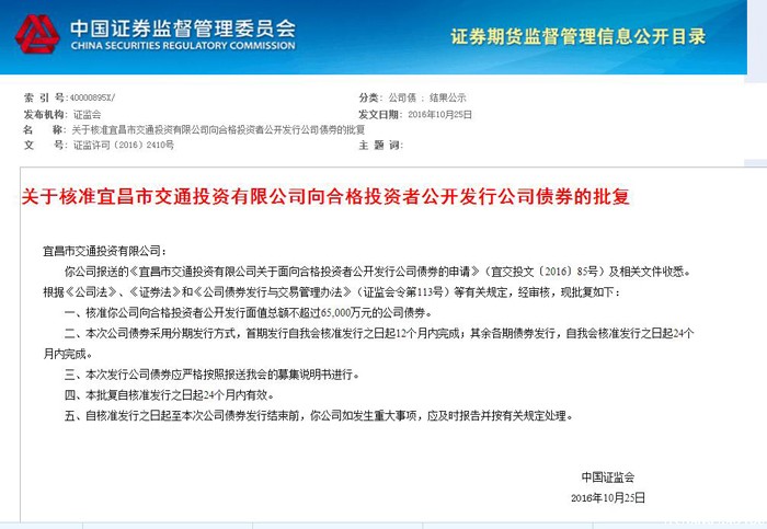 2016年10月25日,筆者從中國證券監督管理委員會獲悉,根據中國證監會證監許可【2016】2410號《關于核準宜昌市交通投資有限公司向合格投資者公開發行公司債券的批復》文件,交投公...
